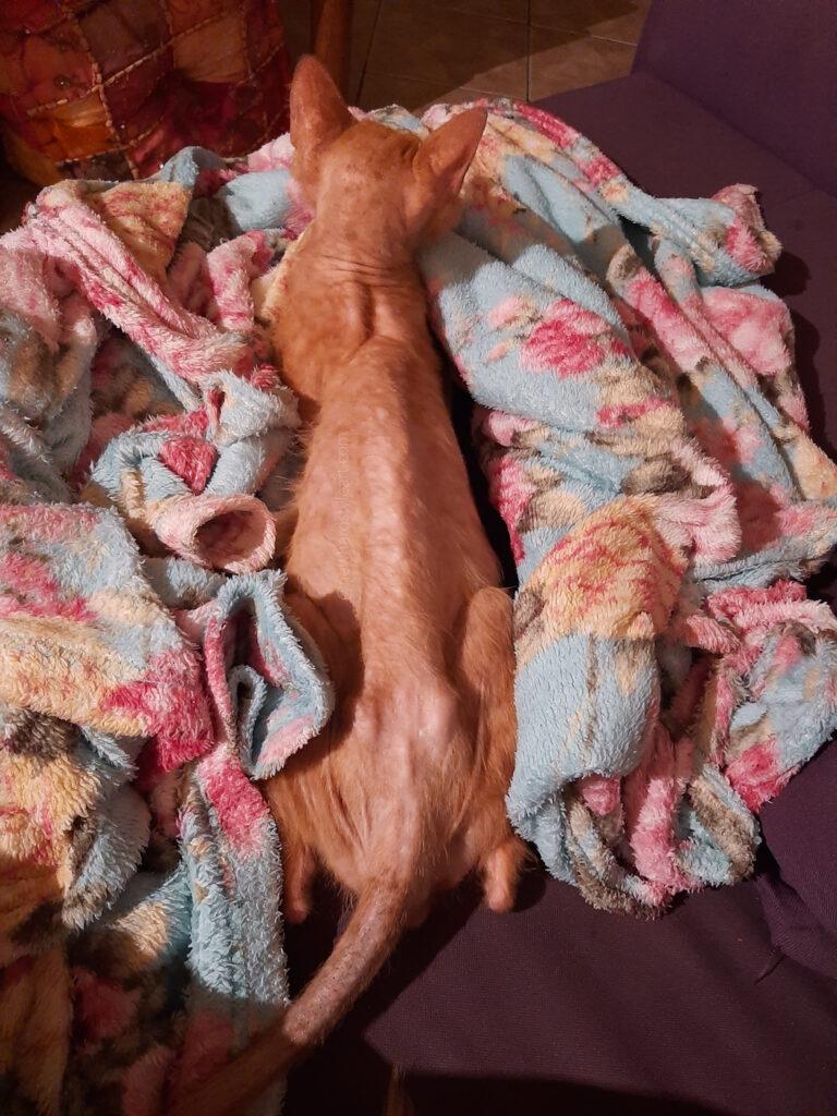 Ganz verschüchtert und trotzdem immer wieder mutig, suchte er unsere Nähe und kuschelte sich mit in die Decke. Während das Fell noch auf sich warten ließ, schossen seine Schnurrhaare dafür wie Pilze aus dem Boden.