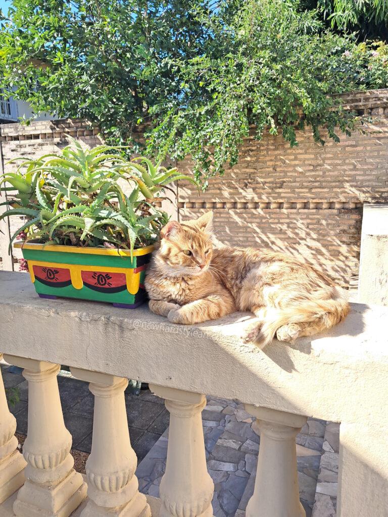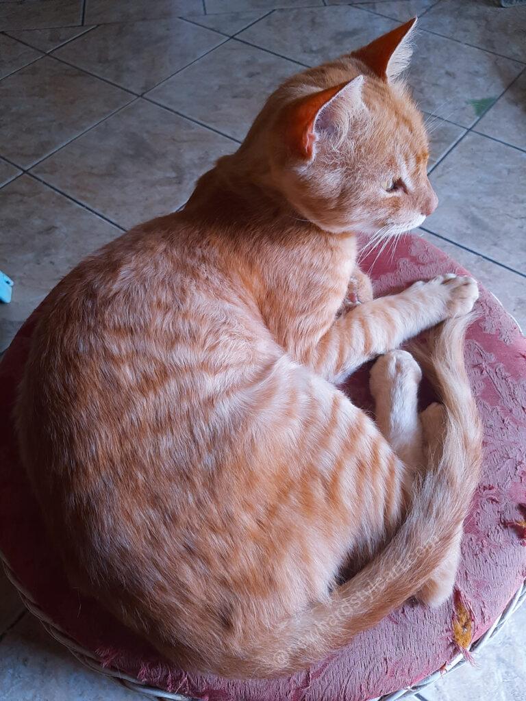 Sein Lieblingsplatz ist ein kleiner Hocker mit Blick nach draußen und immer einer frischen Brise (Wind) um die Nase. Der Hocker hat lustigerweise auch seine Rettungsgeschichte. Er stand ganz allein aussortiert auf der Straße und hatte sein neues Leben noch vor sich.