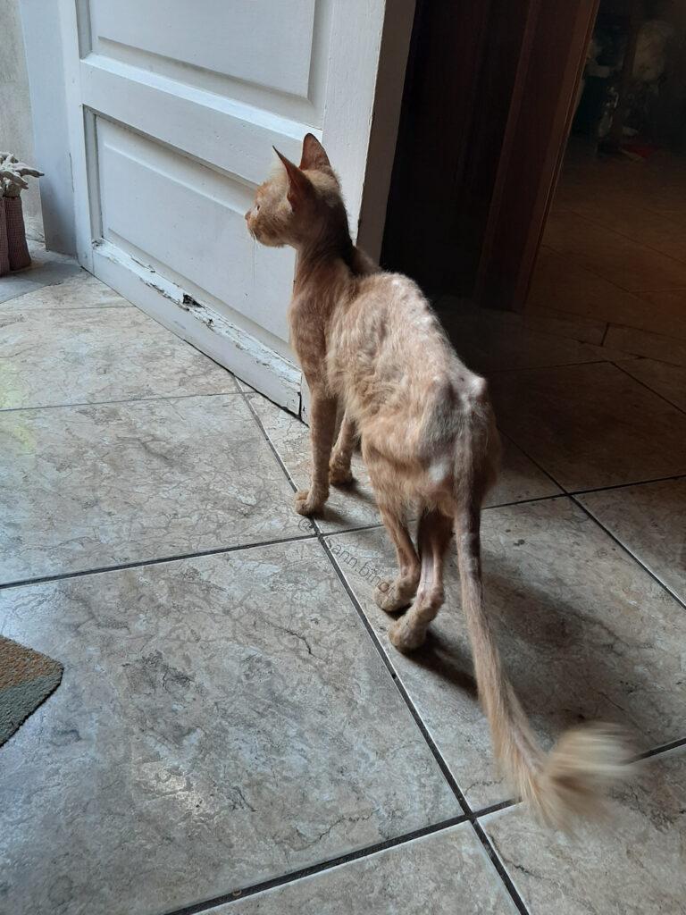 Wir mussten genau hinsehen, bis wir erkannten, dass ES ein völlig abgemagerter Kater war. Er hatte kaum Fell, abgebrochene, spröde Schnurrhaare (Vibrissen, Sinushaare) und sah wie ein gerupftes Huhn aus, das dem Tod noch einmal von der Schippe gesprungen ist. Woher kam er? Fiel er vom Himmel? Was ist ihm passiert? Hoffentlich hatte ihm das kein Mensch angetan. Wir stellten ihm Wasser und etwas zum Fressen hin und zogen uns zurück. Er sollte sich erst einmal stärken und zur Ruhe kommen. Zu unserer großen Verwunderung suchte er die nächsten Tage (zwar noch sehr ängstlich) mehr und mehr Kontakt. Dass dieser kleine Kerl sich überhaupt noch auf den Beinen halten konnte, zeigte deutlich seinen Überlebenswillen.