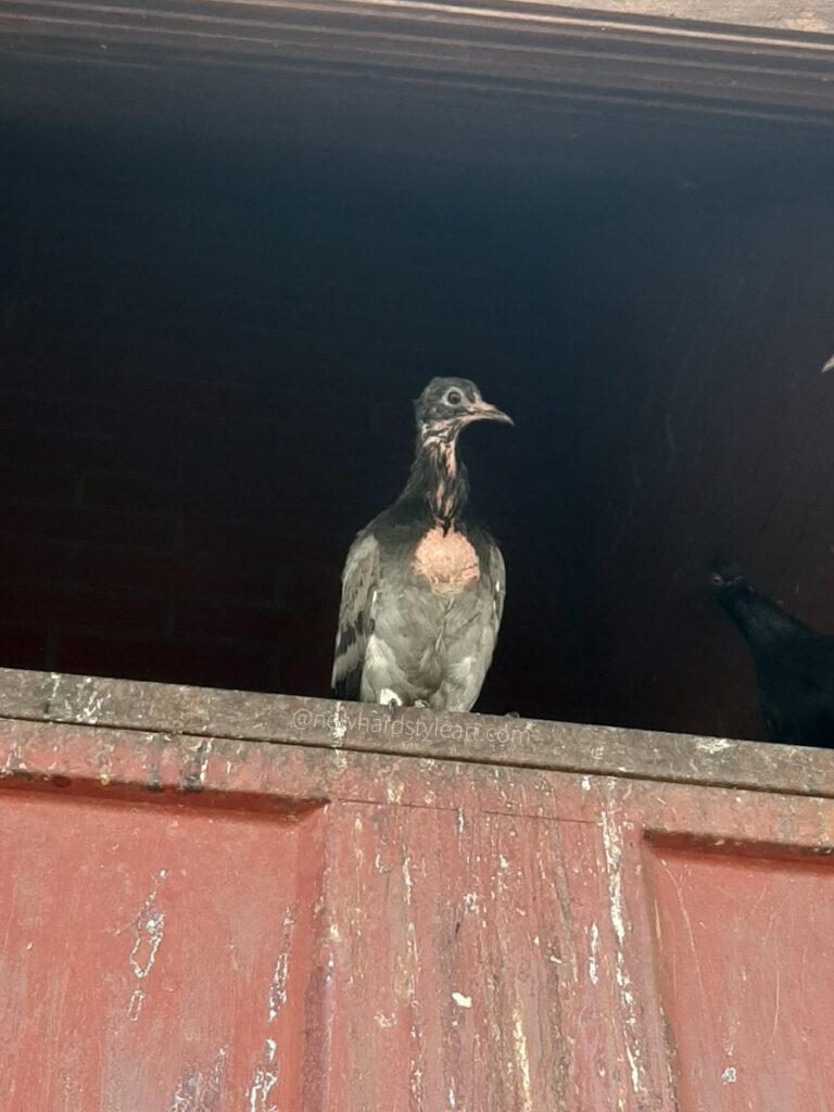 Aufgrund seiner Schnabelform dachten wir anfangs, dass es ein Straußenbaby sein könnte und dass dieses Baby aus einem Straußengehege, welches nicht weit weg von uns liegt, ausgebüxt ist. Gedacht – Getan, wir fuhren dorthin. Nein, es handelte sich nicht um ein Straußenbaby. Zuhause angekommen meldete sich Renés Cousine, die zwischenzeitlich Google gefragt hatte und uns mitteilte: Herzlichen Glückwunsch! Ihr seid Eltern von einem Taubenküken.